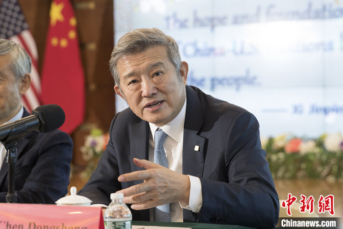 當(dāng)?shù)貢r(shí)間10月25日,參加清華大學(xué)和美中關(guān)系全國委員會(huì)共同舉辦的“中美民眾對(duì)話”活動(dòng)的部分代表來到中國駐紐約總領(lǐng)事館,就中美經(jīng)貿(mào)關(guān)系、科研合作、人文交流等回答記者提問。被問及中國企業(yè)在美國投資的相關(guān)問題時(shí),泰康保險(xiǎn)集團(tuán)董事長陳東升表示,貿(mào)易和投資對(duì)中美關(guān)系十分重要。在美國投資,比如康復(fù)醫(yī)療是一個(gè)大的合作方向,我們歡迎美國的企業(yè)來合作,這是互利互惠的過程。 中新社記者 廖攀 攝