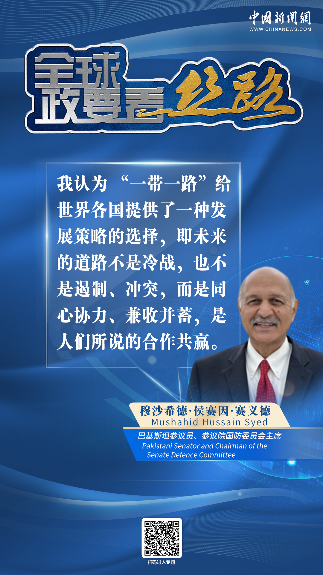 中新網(wǎng)10月28日電(張乃月) “‘一帶一路’給世界各國提供了一種發(fā)展策略的選擇,即未來的道路不是冷戰(zhàn),也不是遏制、沖突,而是同心協(xié)力、兼收并蓄,是人們所說的合作共贏?!卑突固箙⒆h員、參議院國防委員會(huì)主席穆沙希德·侯賽因·賽義德近日接受中新網(wǎng)專訪時(shí)如是說。