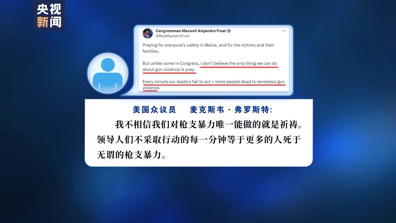 此外,每次槍擊案發(fā)生后,美國(guó)擁槍派政客都重復(fù)著空洞的安慰,這次也不例外。在多位擁槍派政客的社交媒體上,各種口頭安慰和無(wú)力的陳詞濫調(diào)比比皆是。對(duì)此,美國(guó)眾議員麥克斯韋·弗羅斯特(Maxwell Alejandro Frost)發(fā)推文寫道,“我不相信我們對(duì)槍支暴力唯一能做的就是祈禱。領(lǐng)導(dǎo)人們不采取行動(dòng)的每一分鐘等于更多的人死于無(wú)謂的槍支暴力?!?/p>