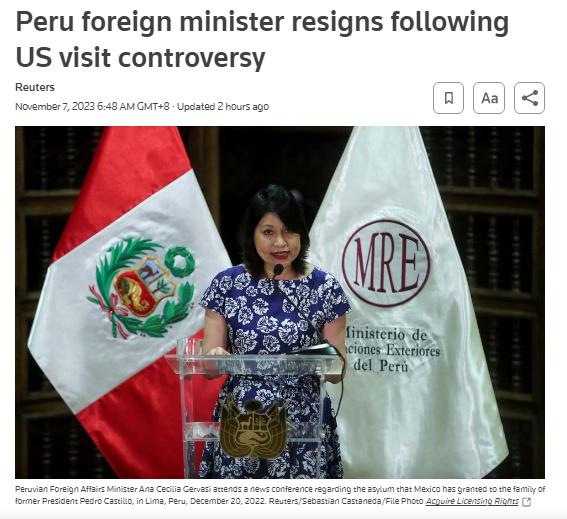中新網(wǎng)11月7日電 據(jù)路透社報道,當?shù)貢r間6日,秘魯外交部長安娜·赫瓦西在其上任不到一年后宣布辭職。