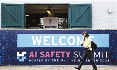 在英國布萊奇利園,警察在首屆人工智能安全峰會上執(zhí)勤。