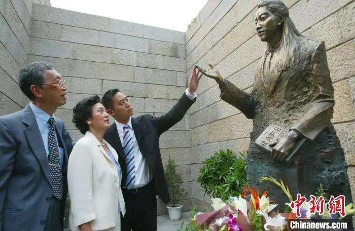 2005年,侵華日軍南京大屠殺遇難同胞紀念館內(nèi),張紹進、張盈盈(左)為女兒張純?nèi)绲袼芙夷弧?資料圖) 中新社記者 泱波 攝