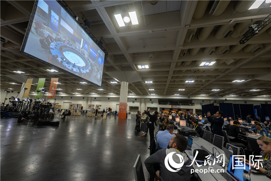 當(dāng)?shù)貢r間11月16日,美國舊金山,在APEC國際媒體中心,媒體記者忙碌工作。