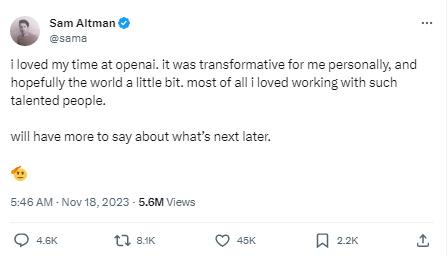 當(dāng)?shù)貢r(shí)間18日,奧特曼在社交平臺(tái)表示,“我很喜歡OpenAI的時(shí)光,這對(duì)我個(gè)人來(lái)說(shuō)是變革性的,也希望通過(guò)重塑世界帶來(lái)一些變革。最重要的是,我喜歡與這些才華橫溢的人一起工作?!?/p>