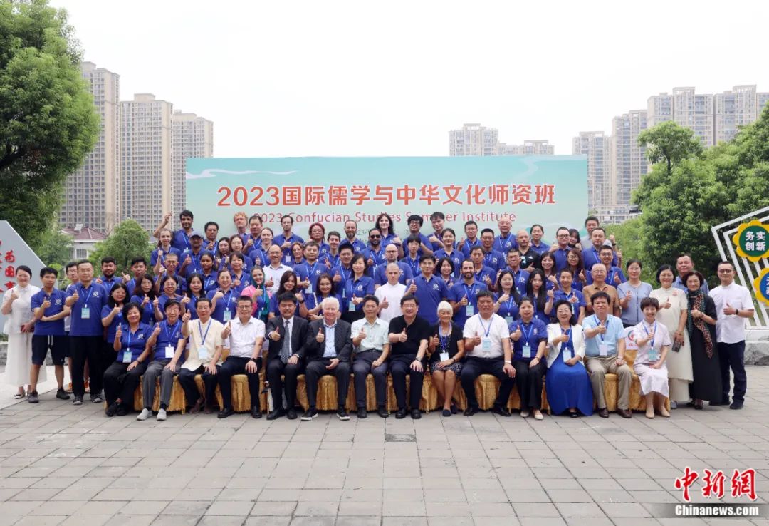 2023年8月14日,與會嘉賓和學(xué)院在活動現(xiàn)場合影。當(dāng)日,由北京外國語大學(xué)與國際儒學(xué)聯(lián)合會聯(lián)合主辦的“2023國際儒學(xué)與中華文化師資班”開班儀式在江蘇省丹陽市舉行,來自20多個國家和地區(qū)的120名學(xué)員,參加為期13天的中華傳統(tǒng)文化研修。李國慶 攝