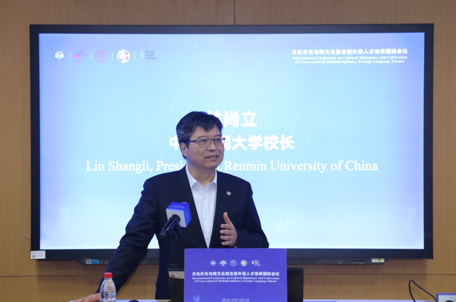 中國人民大學(xué)校長林尚立在會(huì)議開幕式致歡迎辭。林尚立表示,文化外交與跨文化復(fù)合型外語人才培養(yǎng)是語言類學(xué)科的必要之舉,此舉對(duì)未來人類的發(fā)展會(huì)愈發(fā)彰顯其重要性。林尚立認(rèn)為,外語人才的培養(yǎng)應(yīng)該具有文化感、哲學(xué)感,同時(shí)要加深對(duì)世界文化的了解,要有世界眼光,希望外語專業(yè)能夠培養(yǎng)出一批真正具有家國情懷、人類情懷,同時(shí)也具有豐厚人文底蘊(yùn)的新一代文化人,培養(yǎng)出跨文化的文化外交者、跨文化的文化促進(jìn)者。