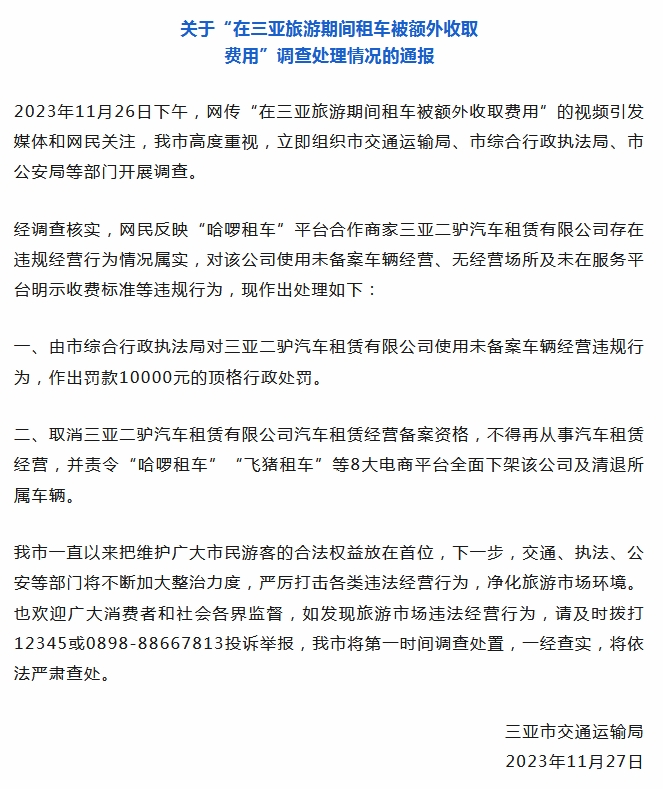 經(jīng)調(diào)查核實,網(wǎng)民反映“哈啰租車”平臺合作商家三亞二驢汽車租賃有限公司存在違規(guī)經(jīng)營行為情況屬實,對該公司使用未備案車輛經(jīng)營、無經(jīng)營場所及未在服務(wù)平臺明示收費標(biāo)準(zhǔn)等違規(guī)行為,現(xiàn)作出處理如下: