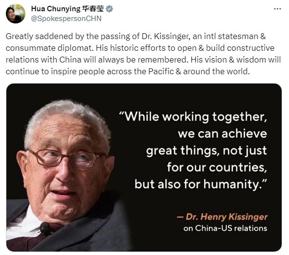 華春瑩寫道,“我對基辛格博士的逝世深感悲痛,他是一位國際政治家和杰出的外交家。我們將永遠(yuǎn)銘記他為開拓和建立同中國的建設(shè)性關(guān)系所作的歷史性努力。他的遠(yuǎn)見和智慧將繼續(xù)激勵太平洋地區(qū)乃至世界各地的人們。”