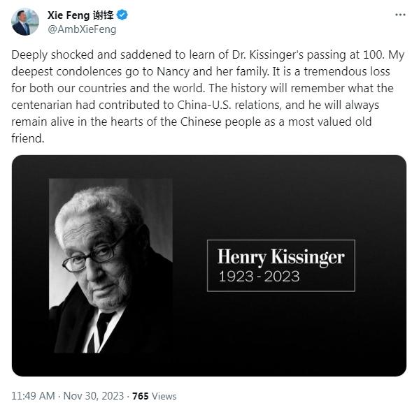 中新網(wǎng)11月30日電 綜合報(bào)道,當(dāng)?shù)貢r(shí)間11月29日,美國前國務(wù)卿基辛格去世。對(duì)此,中國駐美國大使謝鋒在社交平臺(tái)上發(fā)文稱,基辛格去世對(duì)中美兩國和世界來說都是巨大的損失,歷史將銘記這位百歲老人為中美關(guān)系作出的貢獻(xiàn)。