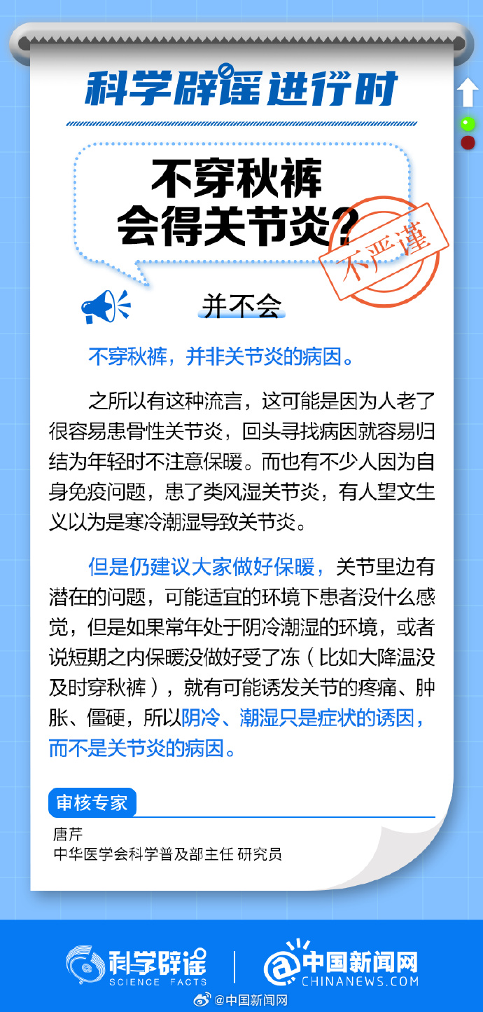 中新網(wǎng)12月11日電 不穿秋褲,并非關節(jié)炎的病因。之所以有這種流言,這可能是因為人老了很容易患骨性關節(jié)炎,回頭尋找病因就容易歸結為年輕時不注意保暖。而也有不少人因為自身免疫問題,患了類風濕關節(jié)炎,有人望文生義以為是寒冷潮濕導致關節(jié)炎。但陰冷、潮濕是疼痛、僵硬等關節(jié)炎癥狀的誘因(而不是病因),仍建議大家做好保暖。(來源:@科學辟謠 @中國新聞網(wǎng))