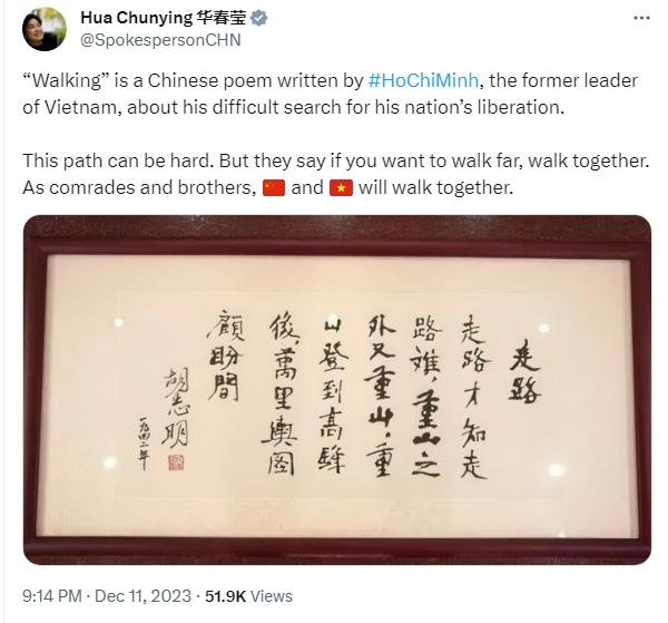 華春瑩寫道,“《走路》是越南老一輩領(lǐng)導(dǎo)人胡志明所寫的一首漢語詩,講述了他爭取國家解放的艱難歷程。這條路可能很艱難。但人們說,如果想走得遠(yuǎn),就要一起走。作為同志和兄弟,中國和越南將一路同行?!?/p>