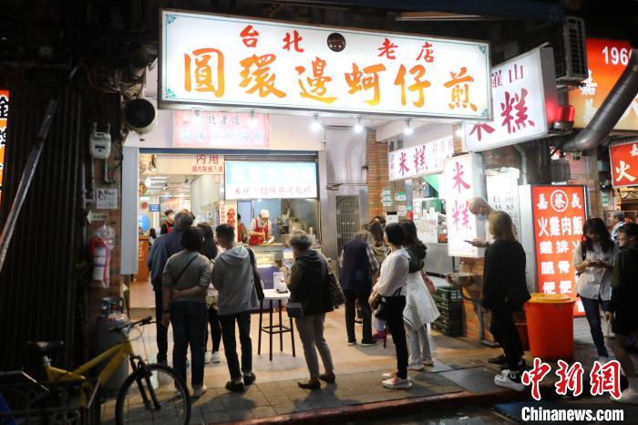 近日,臺(tái)北寧夏夜市里的圓環(huán)邊蚵仔煎店,顧客在門(mén)口排隊(duì)?!≈行律缬浾?陳小愿 攝