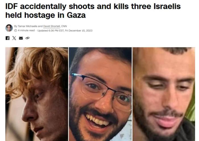 據(jù)美國有線電視新聞網(wǎng)(CNN)報道,以色列國防軍發(fā)言人赫格里在新聞發(fā)布會上表示,“在謝賈亞的戰(zhàn)斗中,以色列國防軍錯誤地將三名以方人質(zhì)視為威脅。軍隊向其開火,他們被打死。”