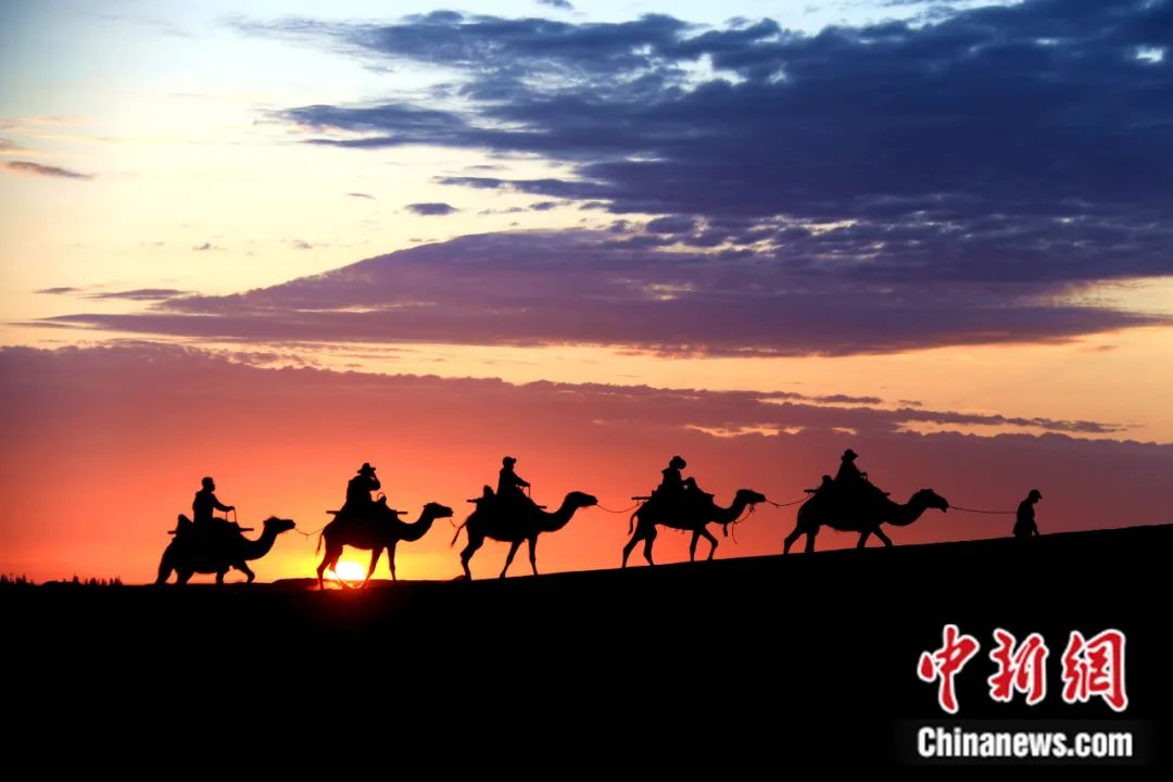 中國(guó)甘肅敦煌鳴沙山月牙泉景區(qū)的沙漠駝隊(duì)。敦煌是古代絲綢之路上的重鎮(zhèn),歷史上東西方文化交匯的重要樞紐。張曉亮 攝