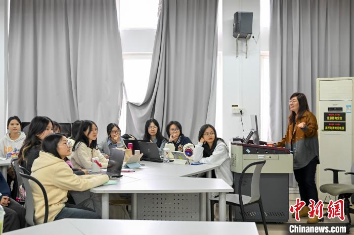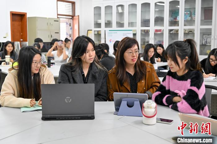 近日,謝雅卉(左三)與同學們在課堂上討論廣告設(shè)計內(nèi)容。中新社記者 陳驥旻 攝