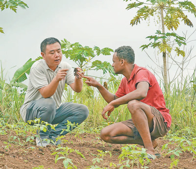 7月15日,在圣多美和普林西比洛巴塔縣卡德拉斯村,中國(guó)援圣普農(nóng)牧業(yè)技術(shù)專(zhuān)家組專(zhuān)家許州達(dá)在田間指導(dǎo)農(nóng)戶努內(nèi)斯種植辣椒。