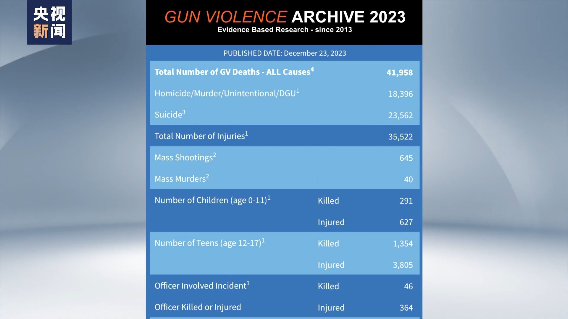 據(jù)美國“槍支暴力檔案”網(wǎng)站統(tǒng)計,截至12月23日,今年美國已發(fā)生645起造成除槍手外、至少4人死傷的大規(guī)模槍擊事件,近4.2萬人在各類涉槍事件中死亡。(央視新聞客戶端)