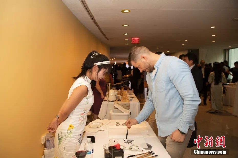 資料圖:當(dāng)?shù)貢r(shí)間6月29日晚,“何以文明”特展發(fā)布儀式在紐約聯(lián)合國總部舉行,與會(huì)嘉賓體驗(yàn)中國書法。中新社記者 廖攀 攝
