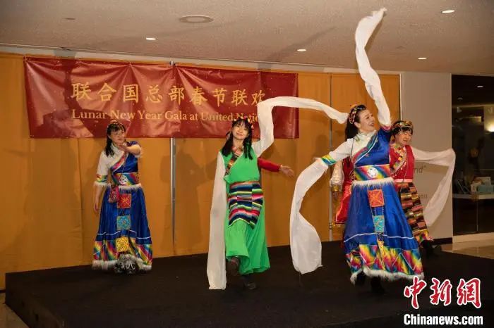 資料圖:當(dāng)?shù)貢r(shí)間1月20日,聯(lián)合國中國書會(huì)舞蹈團(tuán)在紐約聯(lián)合國總部舉辦的春節(jié)聯(lián)歡晚會(huì)上表演《格桑拉》。中新社記者 廖攀 攝