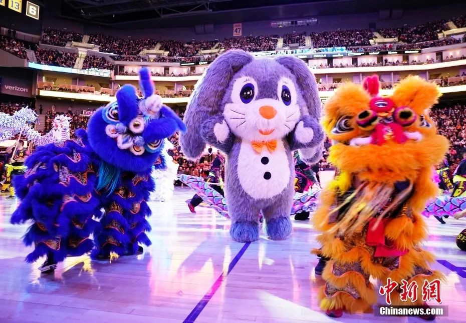 資料圖:當(dāng)?shù)貢r(shí)間1月22日,中國農(nóng)歷新年正月初一晚,美職籃(NBA)金州勇士隊(duì)在主場(chǎng)迎戰(zhàn)布魯克林籃網(wǎng)隊(duì)的比賽中,按照多年的傳統(tǒng)慶祝中國農(nóng)歷新年的到來。圖為兔子人偶出現(xiàn)在舞龍舞獅表演中。中新社記者 劉關(guān)關(guān) 攝