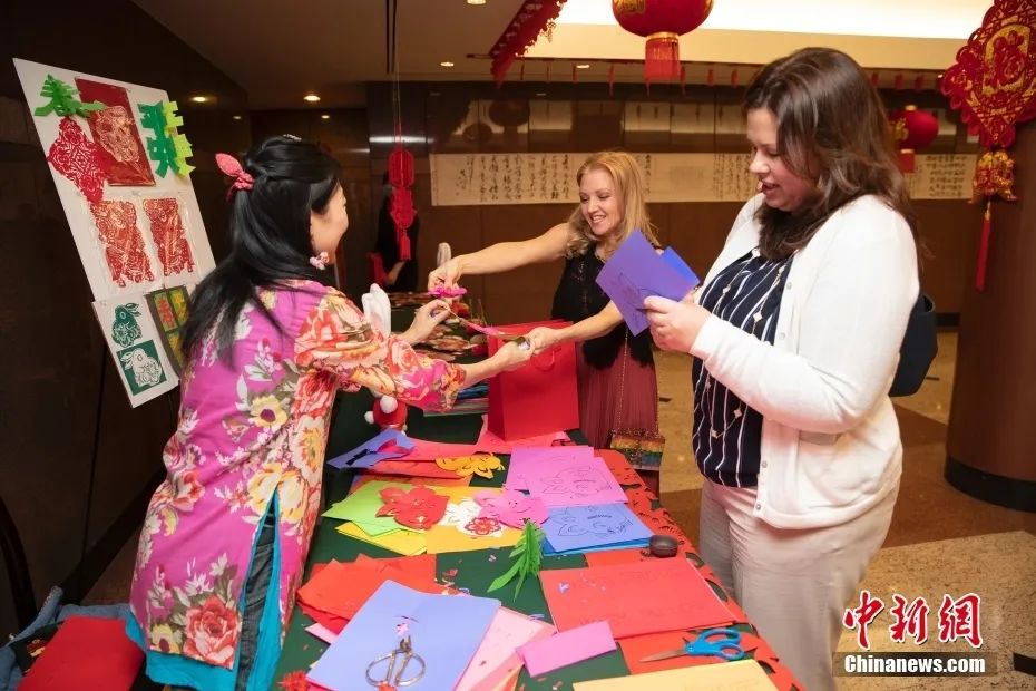 資料圖:來賓在招待會(huì)現(xiàn)場(chǎng)體驗(yàn)中國傳統(tǒng)年俗文化剪紙。中新社記者 廖攀 攝