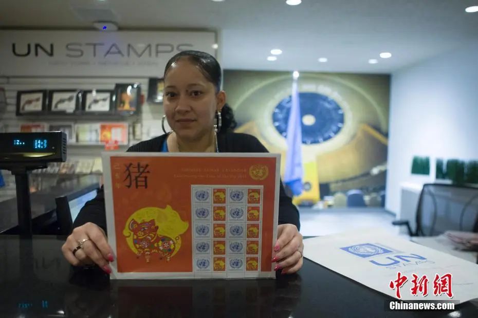 資料圖:2019年1月11日,為慶祝即將到來的中國農(nóng)歷己亥豬年,聯(lián)合國郵政管理處正式發(fā)行“中國農(nóng)歷生肖”系列己亥豬年特別版郵票。圖為紐約聯(lián)合國總部郵管處銷售點(diǎn)的工作人員展示己亥豬年特別版郵票。中新社記者 馬德林 攝