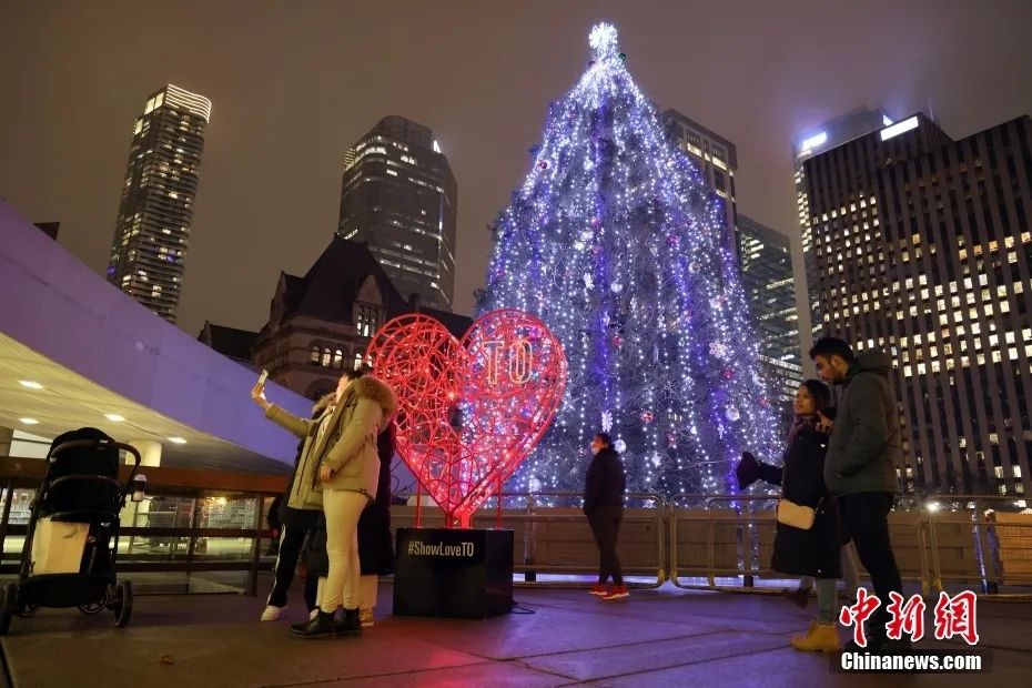 資料圖:當(dāng)?shù)貢r(shí)間2021年12月24日,圣誕平安夜,加拿大多倫多市政廳廣場(chǎng)的圣誕樹與愛心造型的彩燈吸引民眾駐足留影。中新社記者 余瑞冬 攝