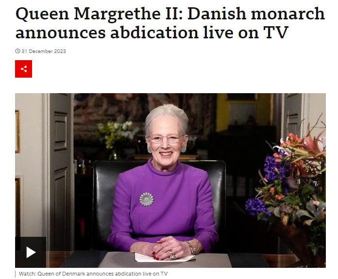 中新網(wǎng)1月1日電 綜合外媒報(bào)道,當(dāng)?shù)貢r(shí)間2023年12月31日,現(xiàn)年83歲的丹麥女王瑪格麗特二世在發(fā)表新年致辭時(shí)宣布,2024年1月14日是她登基52周年紀(jì)念日,屆時(shí)她將退位,把王位傳給其兒子腓特烈王儲。