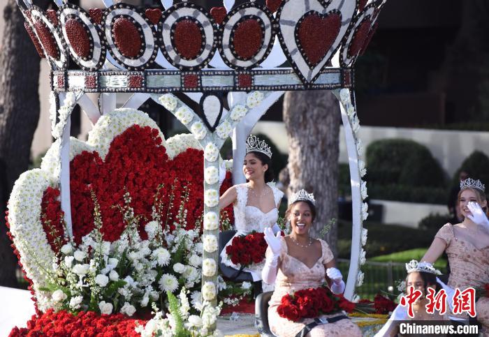 當(dāng)?shù)貢r間1月1日上午,第135屆美國玫瑰花車游行在加利福尼亞州歷史文化名城帕薩迪納市舉行。圖為2024年度“玫瑰皇后和玫瑰公主”花車?!≈行律缬浾?張朔 攝