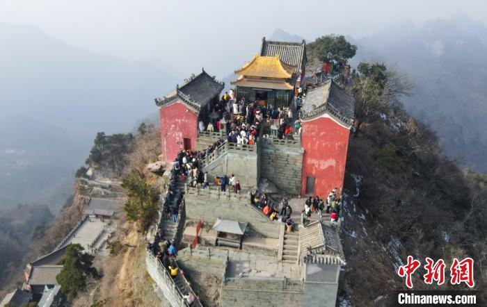 1月1日,武當山金頂上前來祈福的游客絡(luò)繹不絕。(無人機照片)張倩龍 攝