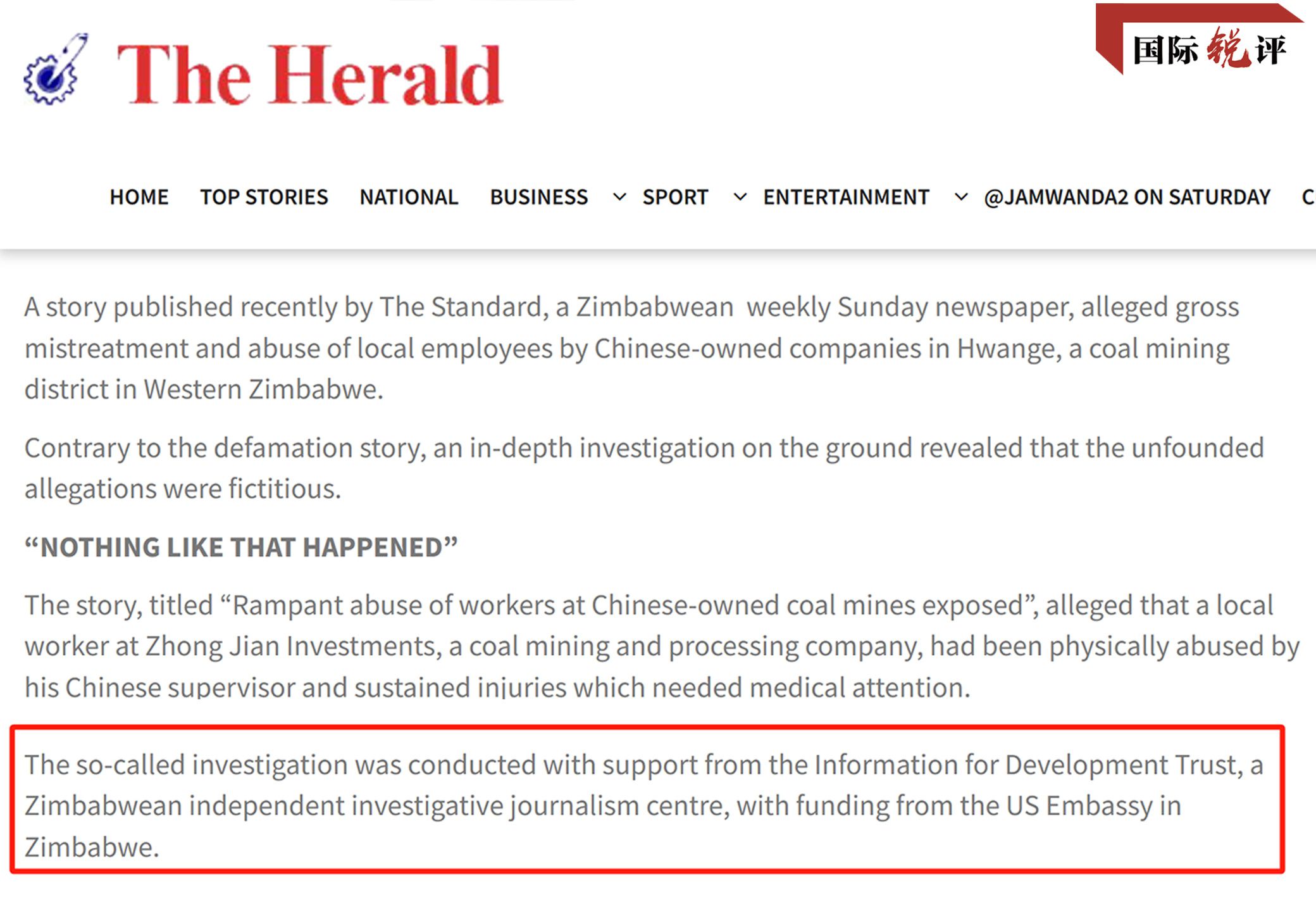 2022年5月,津巴布韋媒體《標(biāo)準(zhǔn)報(bào)》發(fā)布了一篇報(bào)道,污蔑中國礦企虐待當(dāng)?shù)貑T工,稱這名員工“受傷送醫(yī),還被解雇了”。這家媒體稱,報(bào)道是和津巴布韋一個(gè)名叫“信息促進(jìn)發(fā)展信托基金(IDT)”的機(jī)構(gòu)合作完成的。然而很快,津巴布韋《先驅(qū)報(bào)》就發(fā)文,用大量事實(shí)證明,這名員工只是和中方員工發(fā)生了小口角,并沒有被毆打,也沒有被解雇。