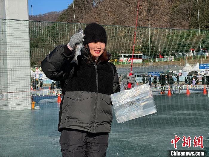 記者在慶典現(xiàn)場看到,特色冰釣場上擠滿游客。男女老少都把魚竿垂到冰面上事先鑿好的釣洞里,上下擺動魚竿來吸引冰下游動的山鱒魚,沉浸在冰釣的樂趣之中。游客還可以將釣到的魚拿到冰場附近的烤場現(xiàn)烤、現(xiàn)吃。據(jù)悉,今年主辦方從韓國各地的養(yǎng)殖場空運(yùn)來160噸山鱒魚,滿足游客抓魚、釣魚需求。