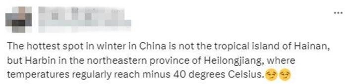 還有網(wǎng)友評(píng)論說(shuō),“中國(guó)冬天最熱的地方,不是海南島,而是黑龍江哈爾濱,盡管那里的氣溫會(huì)達(dá)到零下40攝氏度。”