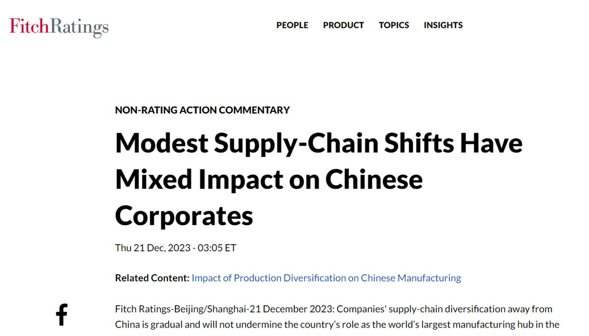 《華爾街日報》的觀察與惠譽評級公司最近的一份報告相呼應。該報告稱,在貿易壁壘和地緣政治緊張局勢加劇背景下,全球性企業(yè)和中資企業(yè)都在推進供應鏈多元化。不過,產能外遷規(guī)模仍然有限,且集中在低技能的組裝和量產領域,如紡織、服裝和鞋類。
