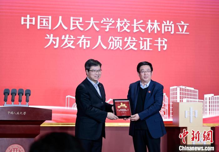 1月8日,由中國人民大學主辦的中國自主的知識體系成果發(fā)布會(2023年度)在中國國家版本館召開。圖為中國人民大學校長林尚立(左)為發(fā)布人中央財經(jīng)大學校長馬海濤頒發(fā)證書。