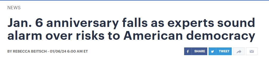 這項(xiàng)民調(diào)結(jié)果公布之時(shí),正值“國會山騷亂”事件三周年之際,美國也迎來新的選舉年?!秶鴷綀?bào)》網(wǎng)站在6日的報(bào)道中再次提到,目前美國出現(xiàn)了一系列與民主狀況有關(guān)的令人不安的跡象。
