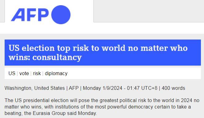 中新網(wǎng)1月10日電 據(jù)法新社報(bào)道,日前,政治風(fēng)險(xiǎn)咨詢公司歐亞集團(tuán)表示,無(wú)論誰(shuí)獲勝,2024年美國(guó)總統(tǒng)選舉都將給世界帶來(lái)最大政治風(fēng)險(xiǎn),美國(guó)制度將會(huì)受到打擊。