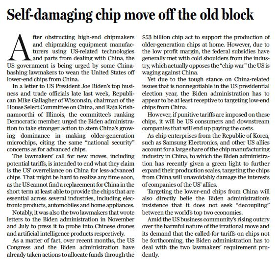 上周晚些時(shí)候,美國(guó)國(guó)會(huì)眾議院“中國(guó)委員會(huì)”主席、威斯康星州共和黨眾議員邁克·加拉格爾,以及該委員會(huì)民主黨籍領(lǐng)袖、來(lái)自伊利諾伊州的拉賈·克里希納莫西,共同向拜登政府的高級(jí)商業(yè)和貿(mào)易官員致信,敦促拜登政府采取強(qiáng)硬措施,阻撓中國(guó)在成熟制程芯片領(lǐng)域占據(jù)主導(dǎo)地位,并稱與高端芯片一樣,在成熟制程芯片領(lǐng)域,中國(guó)同樣威脅了美國(guó)的“國(guó)家安全”。
