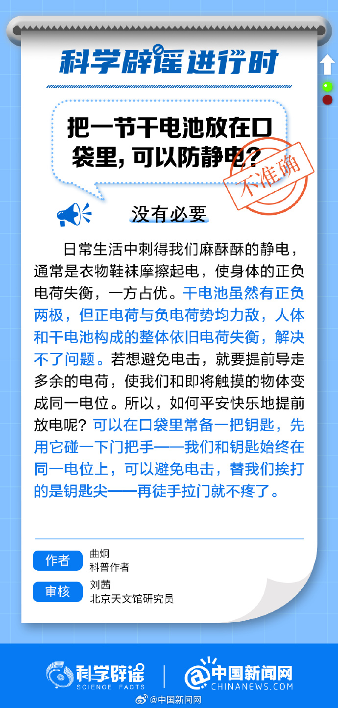 中新網(wǎng)1月11日電 干電池雖然有正負兩極,但正電荷與負電荷勢均力敵,人體和干電池構(gòu)成的整體依舊電荷失衡,解決不了問題。若想避免電擊,就要提前導(dǎo)走多余的電荷,使我們和即將觸摸的物體變成同一電位。所以,如何平安快樂地提前放電呢? 可以在口袋里常備一把鑰匙,先用它碰一下門把手。(來源:@科學(xué)辟謠 中國新聞網(wǎng))