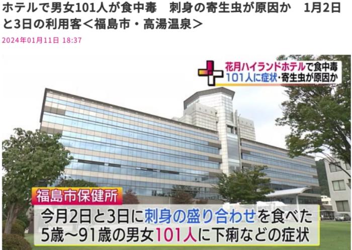 報道稱,中毒者年齡下至5歲,上至91歲。保健所在調(diào)查中發(fā)現(xiàn)該酒店提供的魚類刺身上檢測出寄生蟲,并認(rèn)為這就是導(dǎo)致此次食物中毒的原因。