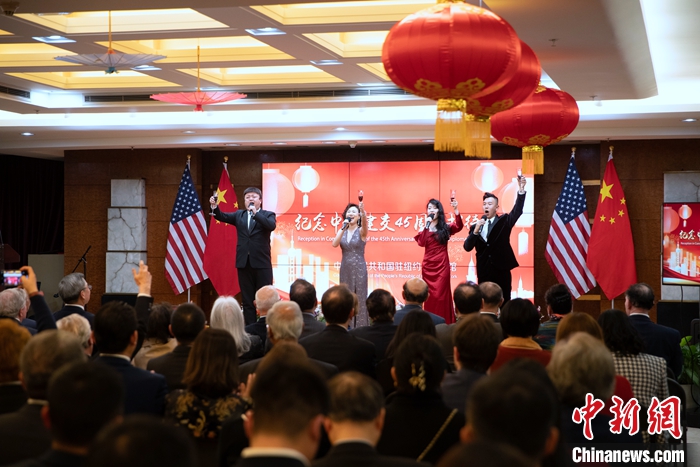 當(dāng)?shù)貢r間1月17日,中國駐紐約總領(lǐng)館舉行中美建交45周年招待會。圖為現(xiàn)場表演美聲聯(lián)唱《為祖國干杯》《飲酒歌》。 中新社記者 廖攀 攝