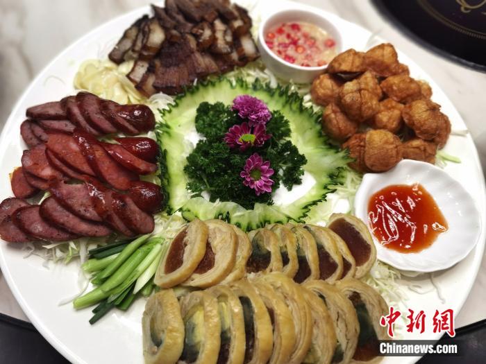 圖為貴州雷山黑毛豬制作的臺灣香腸以及阿里山咸豬肉等拼盤。周燕玲 攝