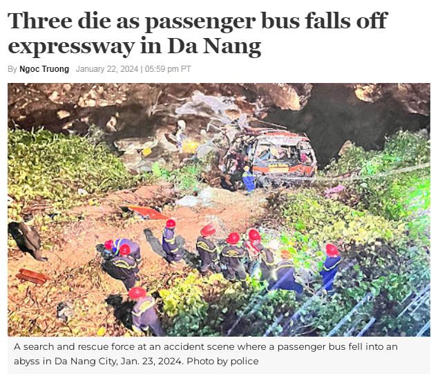 中新網(wǎng)1月23日電 據(jù)越南媒體"VNexpress"報(bào)道,當(dāng)?shù)貢r(shí)間1月23日凌晨1時(shí)30分左右,一輛大客車從越南峴港的高速公路上沖出墜崖,已致3人遇難、3人重傷。