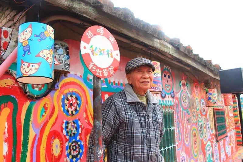 2008年,不舍于老舊眷村拆遷,沒有美術背景的黃永阜對照報紙副刊上的圖畫照片,開始在住家及鄰近房舍墻上、地面以油漆作畫,創(chuàng)作了許多生動逗趣的人物和動物形象,五彩繽紛、充滿童趣的畫風讓眷村增添了生機,并引起外界關注,多彩的村子遂被稱為“彩虹眷村”,黃永阜也收獲“彩虹爺爺”稱號。最終,在各方人士奔走爭取下,彩虹眷村被保留了下來。