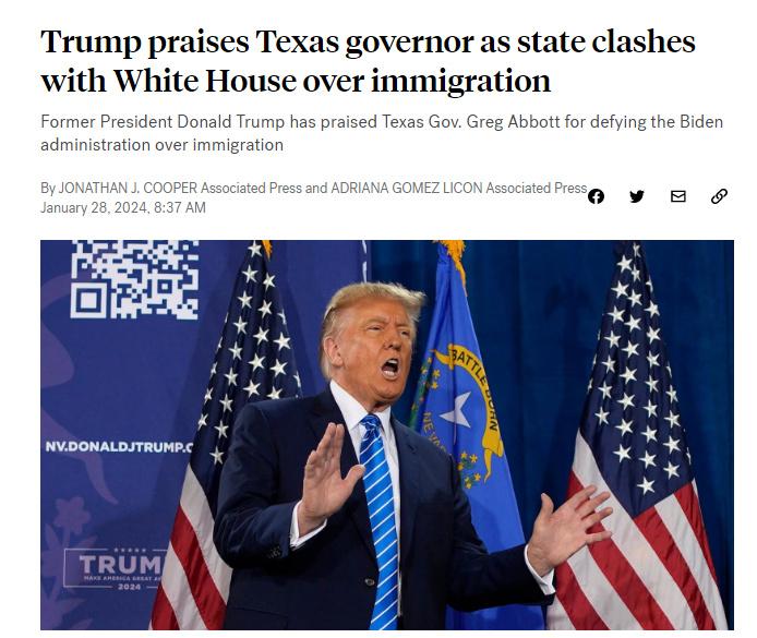 據(jù)報(bào)道,特朗普27日在一場以邊境安全為主要議題的演講中表示,應(yīng)全力支持得克薩斯州在美墨邊境采取的遏制非法移民的措施,并稱贊阿博特在該問題上采取的舉措。
