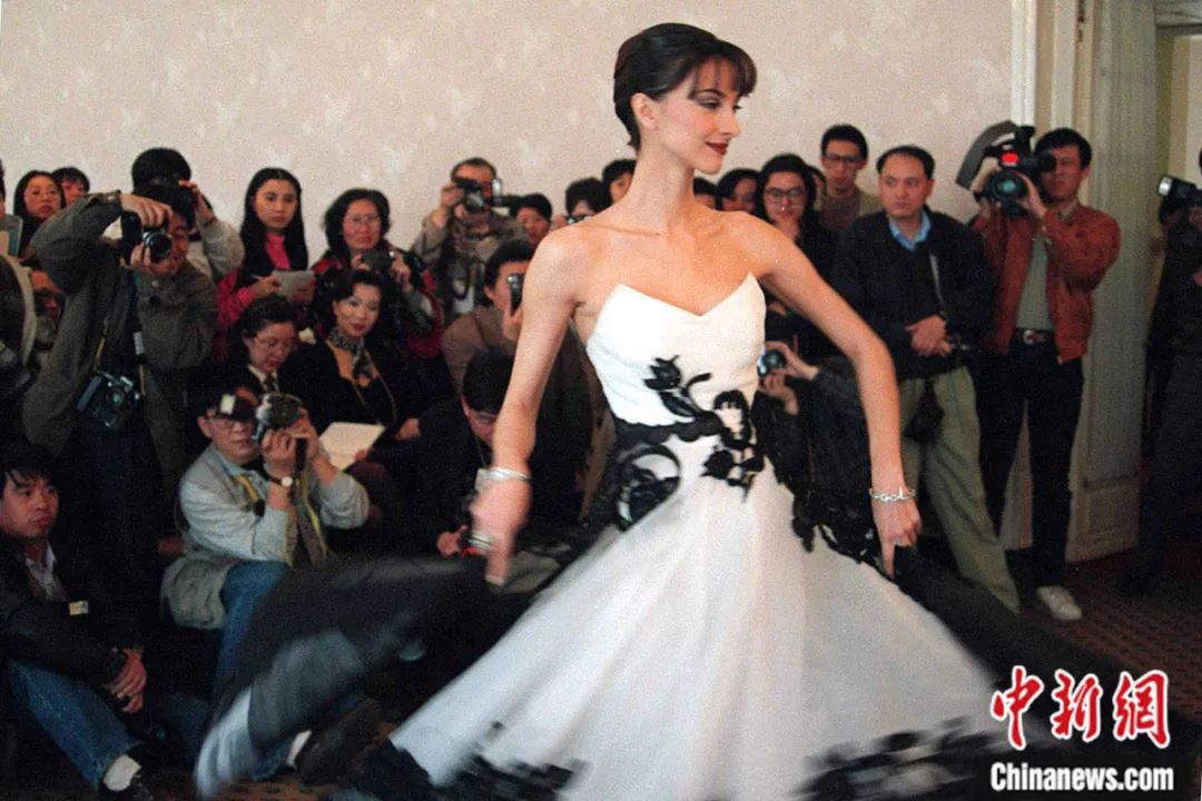 1996年,來(lái)自法國(guó)巴黎的時(shí)裝代表團(tuán)在北京飯店展示服裝。錢興強(qiáng) 攝