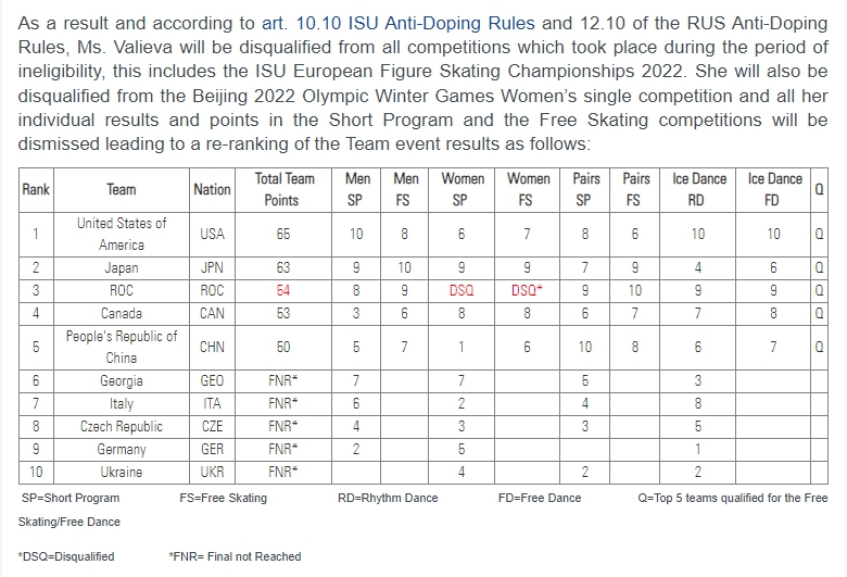 當(dāng)?shù)貢r(shí)間30日,國際滑聯(lián)對北京冬奧會花樣滑冰團(tuán)體成績進(jìn)行了重新計(jì)算,瓦利耶娃所獲得的成績積分被取消,俄羅斯奧委會代表團(tuán)在花樣滑冰團(tuán)體項(xiàng)目中的金牌變?yōu)殂~牌。