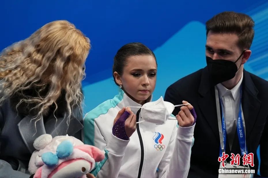 瓦利耶娃(中)在北京冬奧會比賽結(jié)束后等待分?jǐn)?shù) 資料圖 中新社記者 崔楠 攝