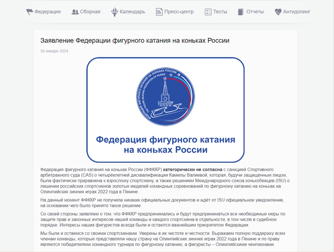 當(dāng)?shù)貢r(shí)間1月30日,俄羅斯花樣滑冰聯(lián)合會(FFKKR)發(fā)布聲明表示,團(tuán)隊(duì)中運(yùn)動員的誠信無可挑剔,“堅(jiān)決不同意國際體育仲裁法庭對卡米拉·瓦利耶娃的處罰”。