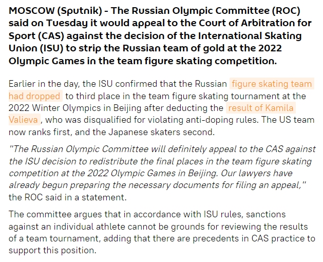 據(jù)俄羅斯衛(wèi)星通訊社報(bào)道,俄羅斯奧委會也在當(dāng)?shù)貢r(shí)間30日表示,將針對俄羅斯花滑運(yùn)動員卡米拉·瓦利耶娃被處以禁賽并取消北京冬奧會俄羅斯奧委會代表團(tuán)花滑團(tuán)體金牌一事,向國際體育仲裁法庭提起上訴。